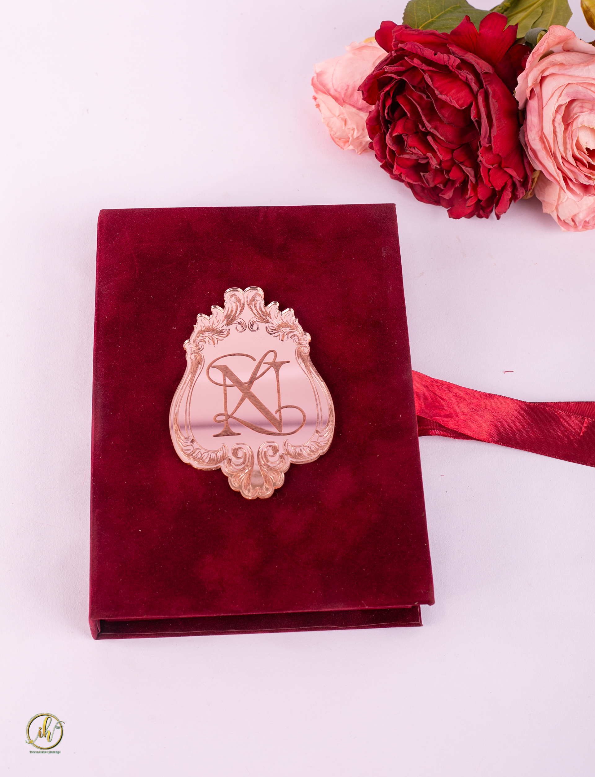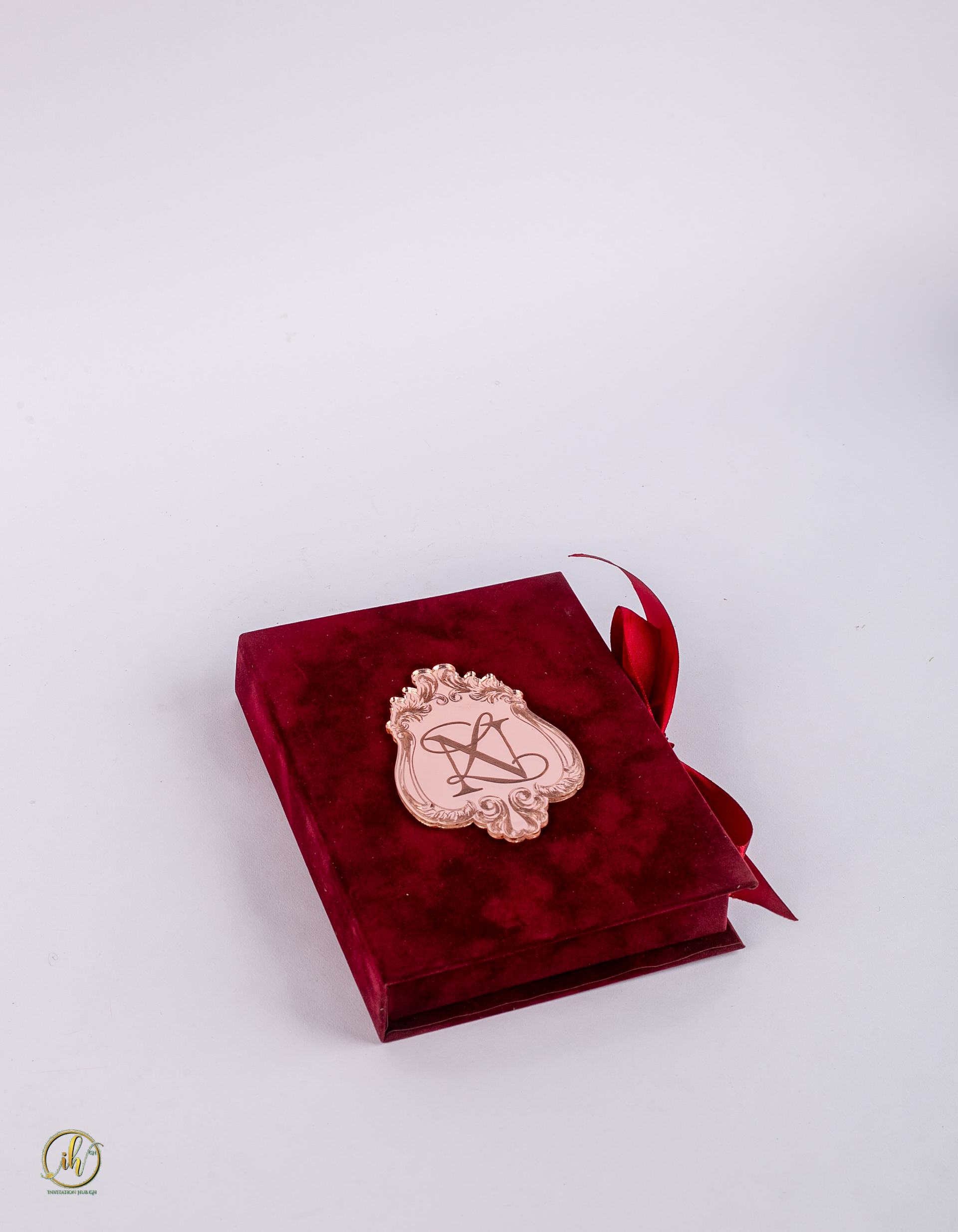A hard cover box made with Velvet. A custom shaped Acrylic invitation placed in the box.