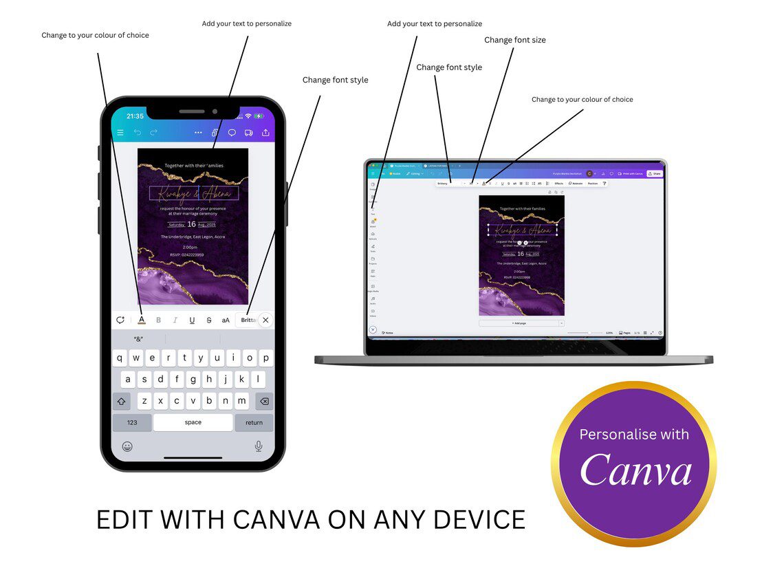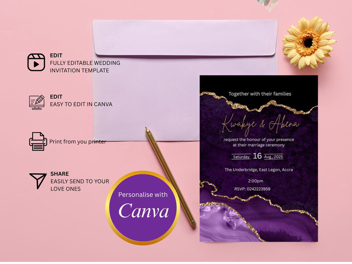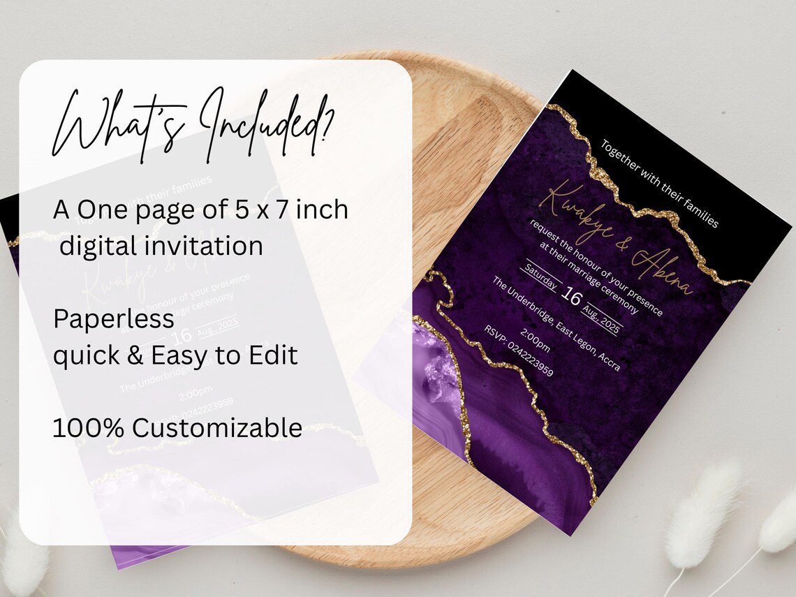 Celebrate your wedding in style with the Purple Marble Wedding Invitation, a modern digital template designed by Invitation Hub GH. This elegant invitation card is ideal for couples who want creative freedom, flexibility, and beautiful design without waiting for shipping.